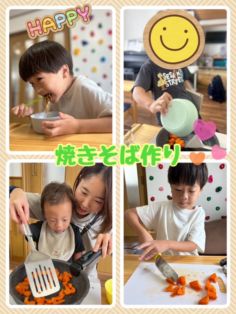 今回は焼きそば作り♪ にんじんを切ってみたり、具材を先生と一緒に炒めたりして、料理を率先して取り組んでくれた子どもたち☺️ 出来上がった焼きそばをおいしそうにぱくぱく食べてお腹もいっぱいになった後は、元気いっぱいに遊んでいた子どもたちです✨