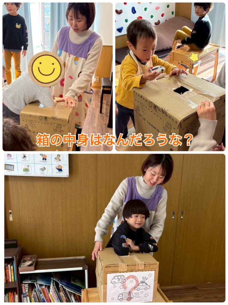 今日の活動は箱の中身はなんだろな?というゲームをやりました。 子どもたちはドキドキしながら箱の中に手を入れて、中身のおもちゃを当てて楽しんでいました! 子どもたちも触っただけでどんなおもちゃかを当てるお友達もいて驚きました☺️