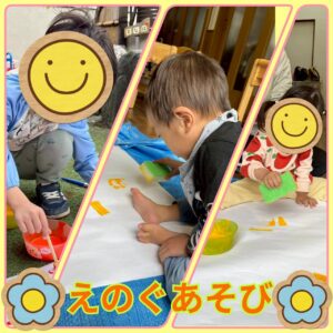 今日は絵の具遊びをしました。赤や黄色、オレンジなど秋の色を使ってみました。 子どもたちはスポンジなど普段は使わない道具を使ってみたり、いつも使う筆なども使って上手に描いていました♪